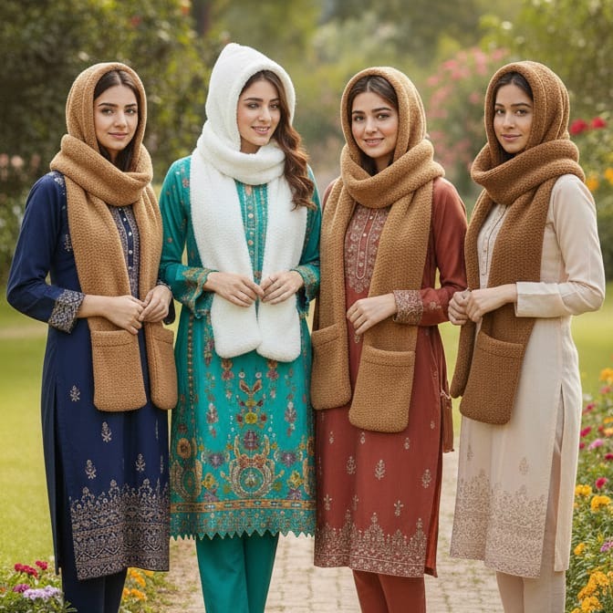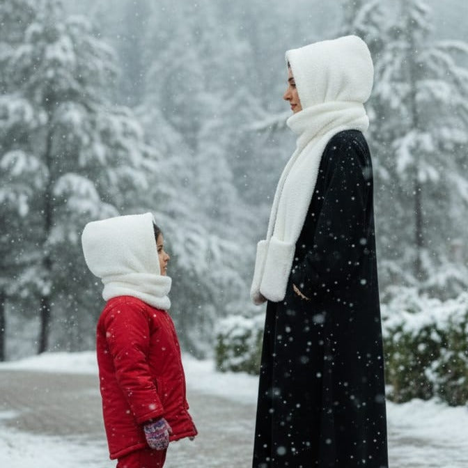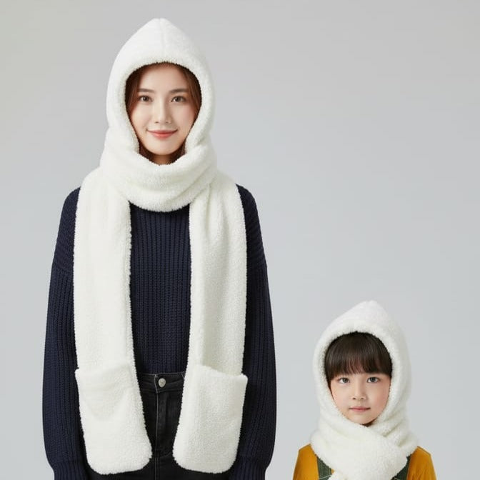 Sardi Ka Behtreen Saathi – Hooded Teddy Scarf Is sardi khud ko aur apne bacho ko rakhein bilkul mahfooz aur stylish! Hamara naya Sherpa Fleece Hooded Scarf sardi ke mausam ke liye ek mukammal solution hai. Yeh sirf ek scarf nahi, balki ismein attach hood aapke sar aur kaano ko thand se bachata hai, aur niche di gayi pockets aapke hathon ko garam rakhti hain.